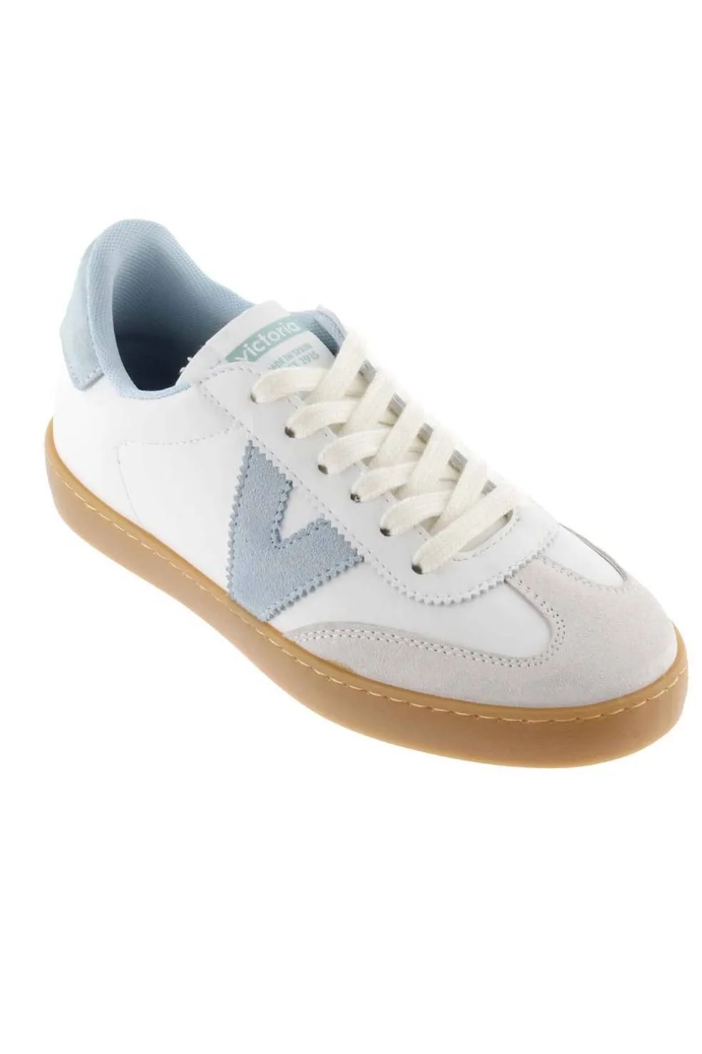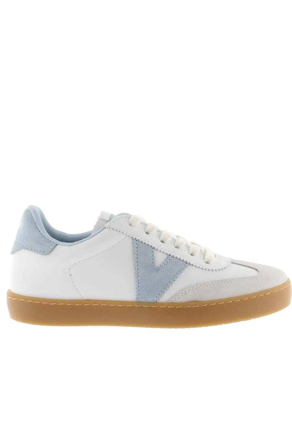 Zapatillas de efecto piel blanca con puntera de serraje en color crudo (nuevo corte ciclista). El logitopo de victoria lateral y la pieza trasera, también en serraje, hacen contraste en colores a juego, así como su forro interior. Suela en color caramelo.