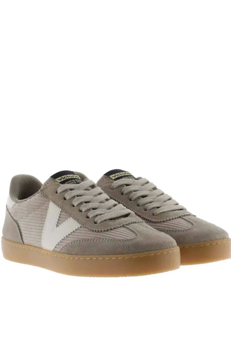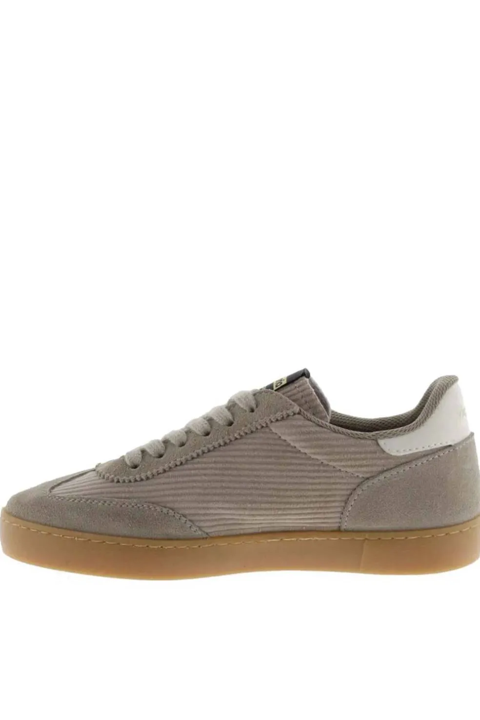 Zapatillas para mujer fabricadas en España en pana y piezas de serraje al tono. V del lateral y pieza trasera en efecto piel blanca en contraste. Cierre mediante cordones al tono y nuevo corte ciclista en la puntera. Su suela traslúcida color caramelo aporta un toque de estilo retro. Además, incluyen una plantilla más ergonómica, confeccionada a partir de materiales reciclados, proporcionando un confort superior en cada paso.