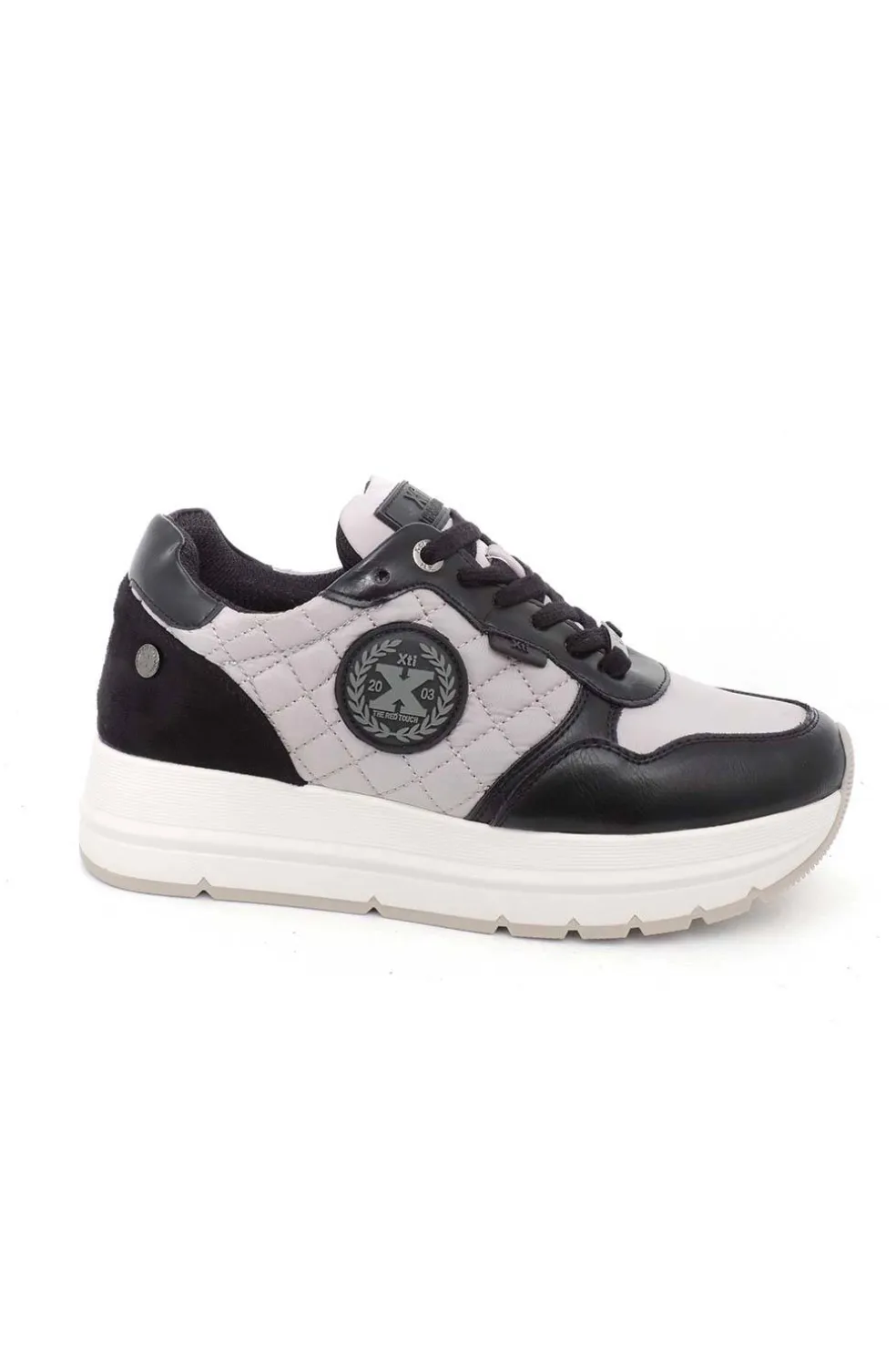Zapatilla de mujer con plataforma de 4 cm. Fabricada en nylon y partes de polipiel negra. Suela de goma antideslizante muy cómoda.