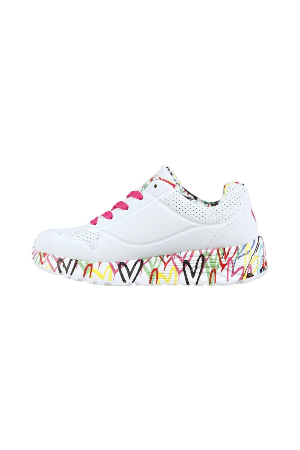 El muralista de renombre internacional James Goldcrown lleva sus icónicos diseños de corazón #Lovewall a las Skechers en esta inspiradora colaboración. Un estilo de lo más adorable y colorido en la Skechers x JGoldcrown: Skechers Street™ Uno Lite – Lovely Luv. Esta zapatilla de tendencia con cordones presenta el conocido diseño de corazón del artista en la media suela, la parte superior de durabuck sintético y ribete perforado con plantilla SKECHERS Air Cooled Memory Foam®.