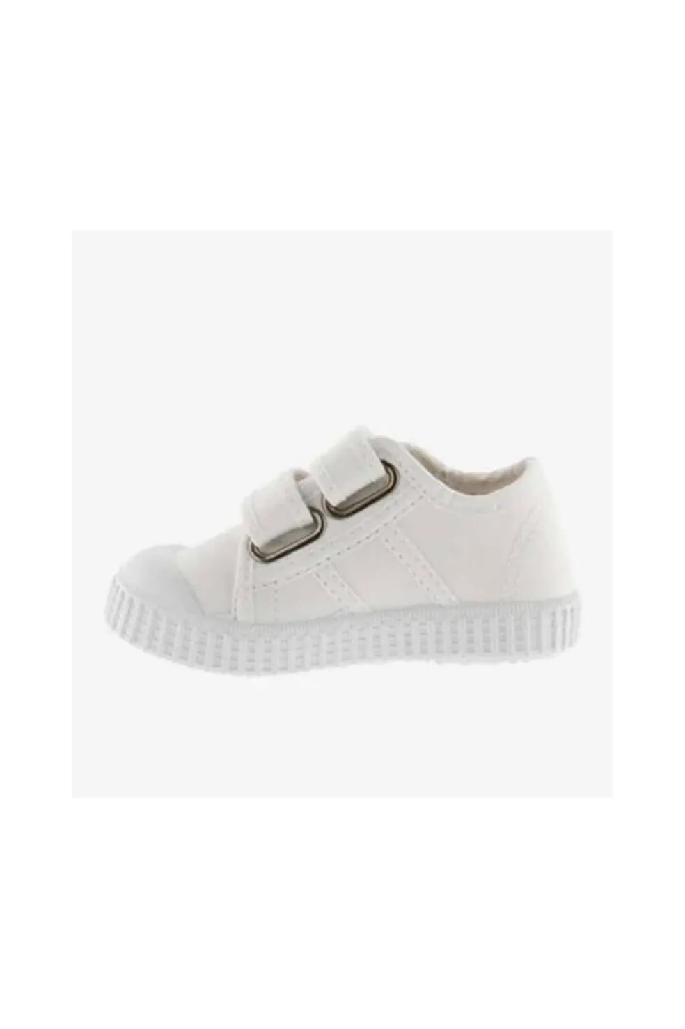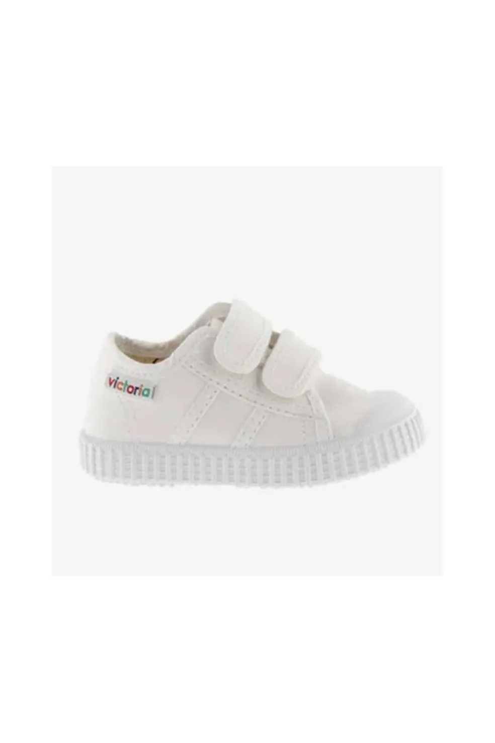 Clásica zapatilla Victoria tipo basket para niños. Fabricadas en España en lona super resistente. Lleva puntera de goma y cierre mediante dos tiras adherentes para que sean muy fáciles de poner y quitar.
