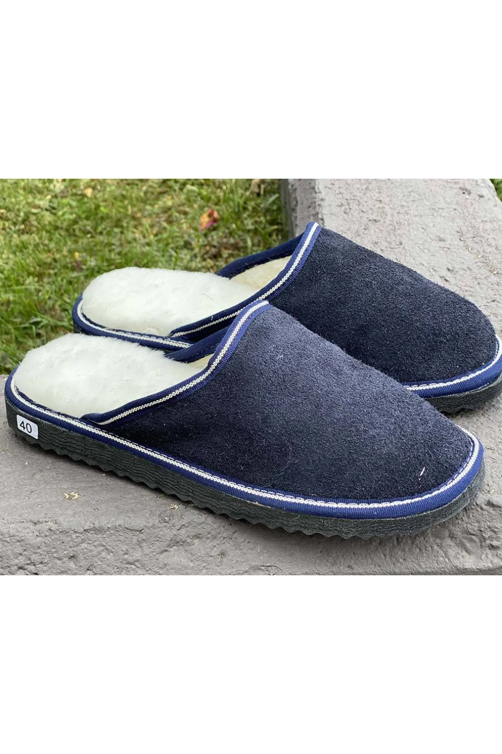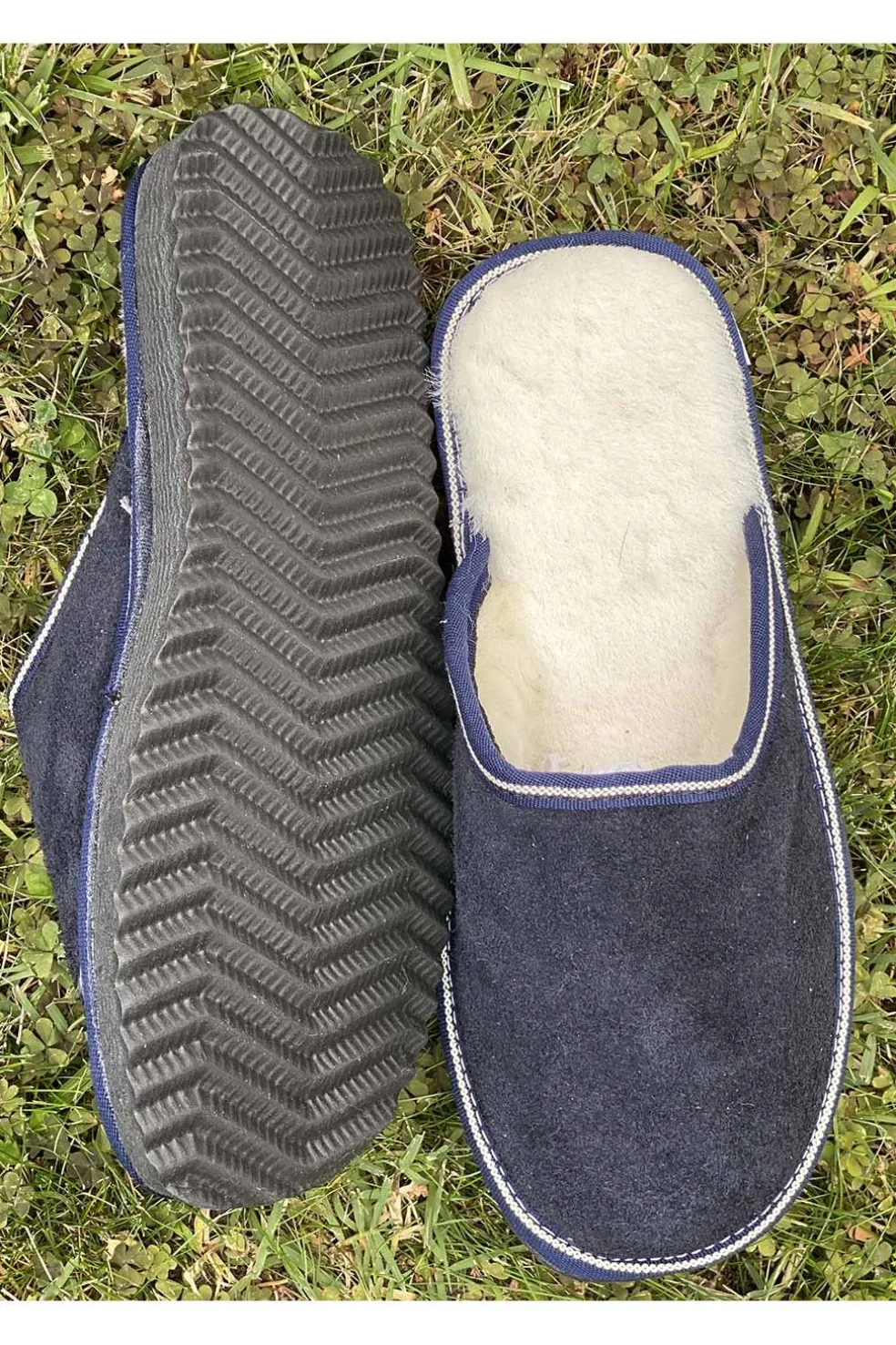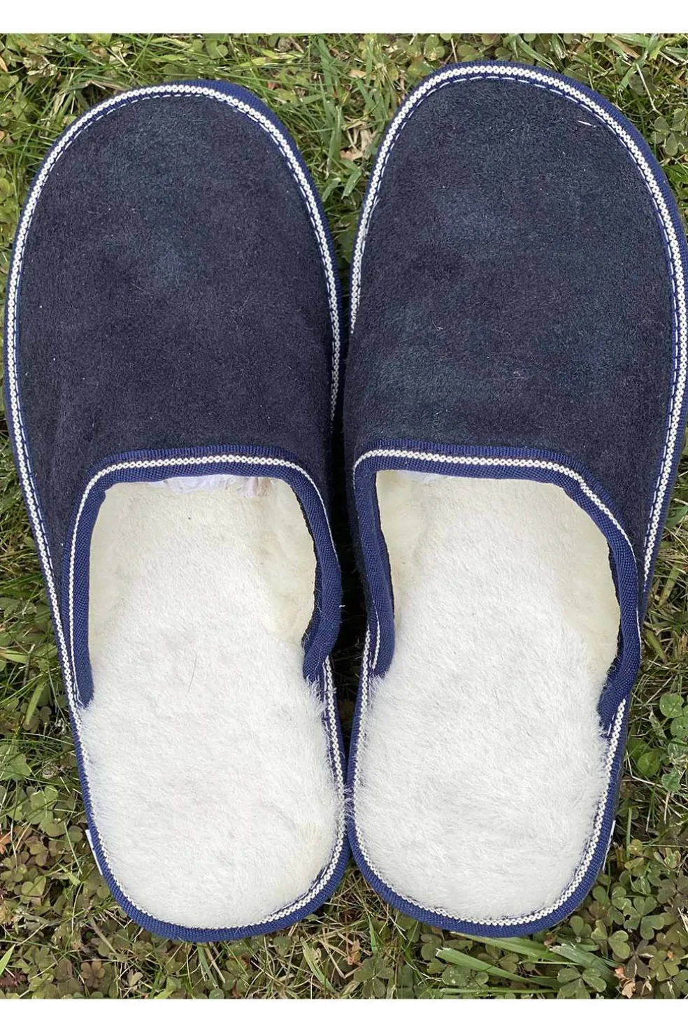 Zapatilla de casa para hombre Medinapiel modelo 24601 en color azul marino, confeccionada en piel suave al tacto. Con diseño abierto por el talón y un interior forrado de pelo, ofrece comodidad y calidez ideales para el hogar.
