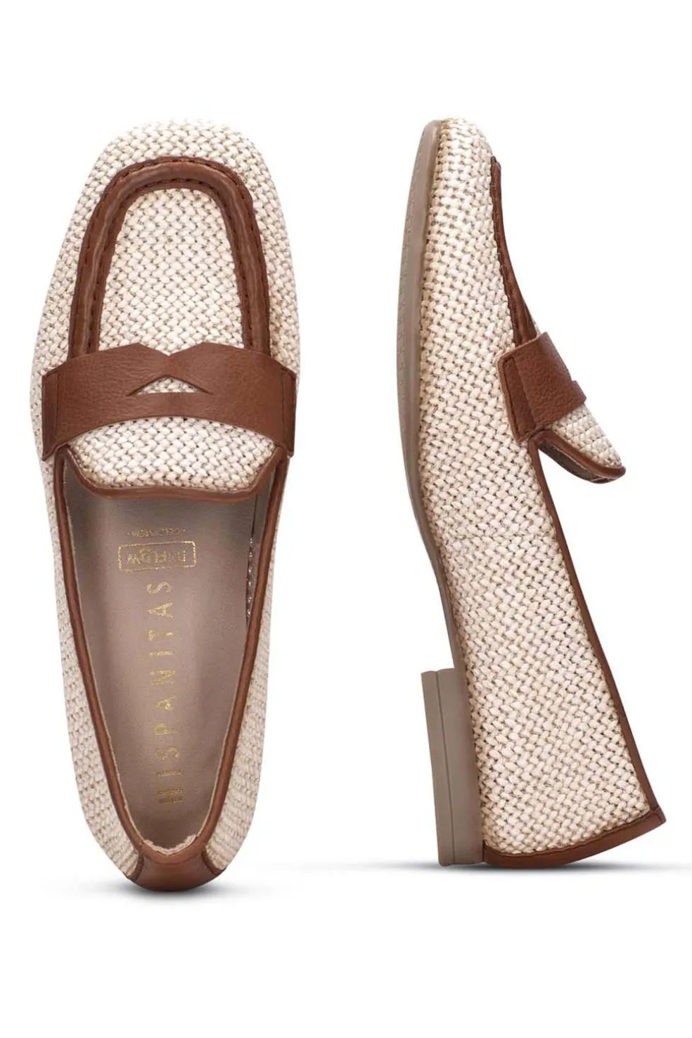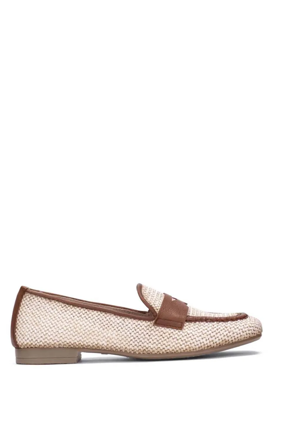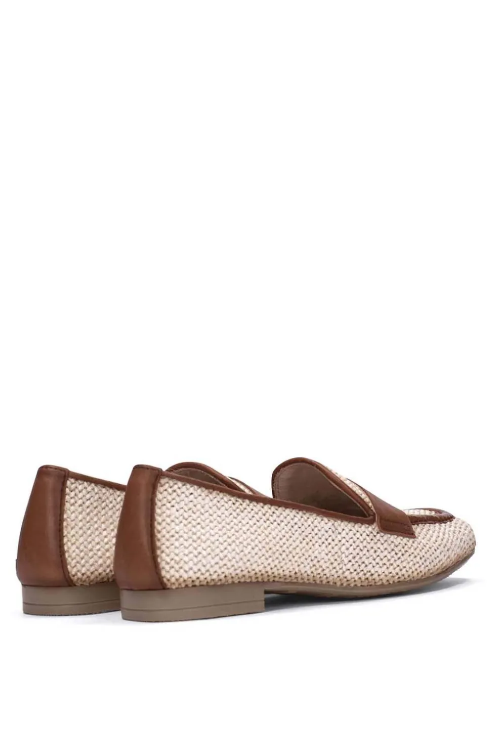 Mocasín con punta cuadrada elaborado en tejido con acabado efecto rafia, combinado con detalles en piel. Este zapato incorpora la tecnología TRIFLOW, amortigua cada paso aportando flexibilidad y confort en la pisada, gracias a su triple almohadillado.