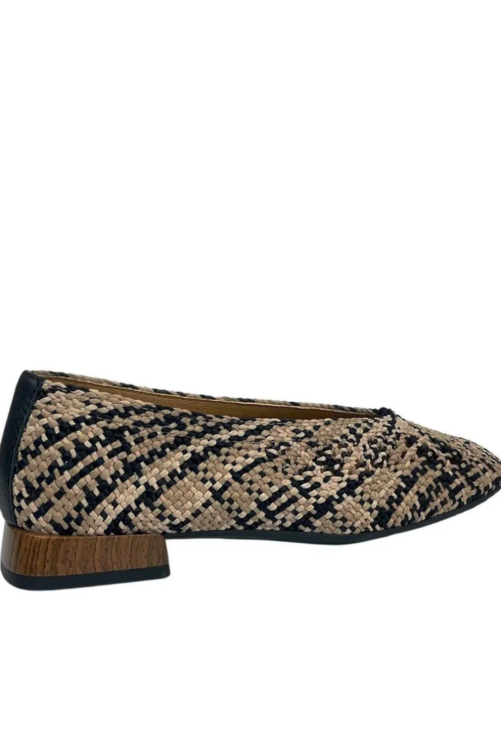 Zapato estilo malonetina fabricada en textil trenzado en color beige,negro y marrón claro.