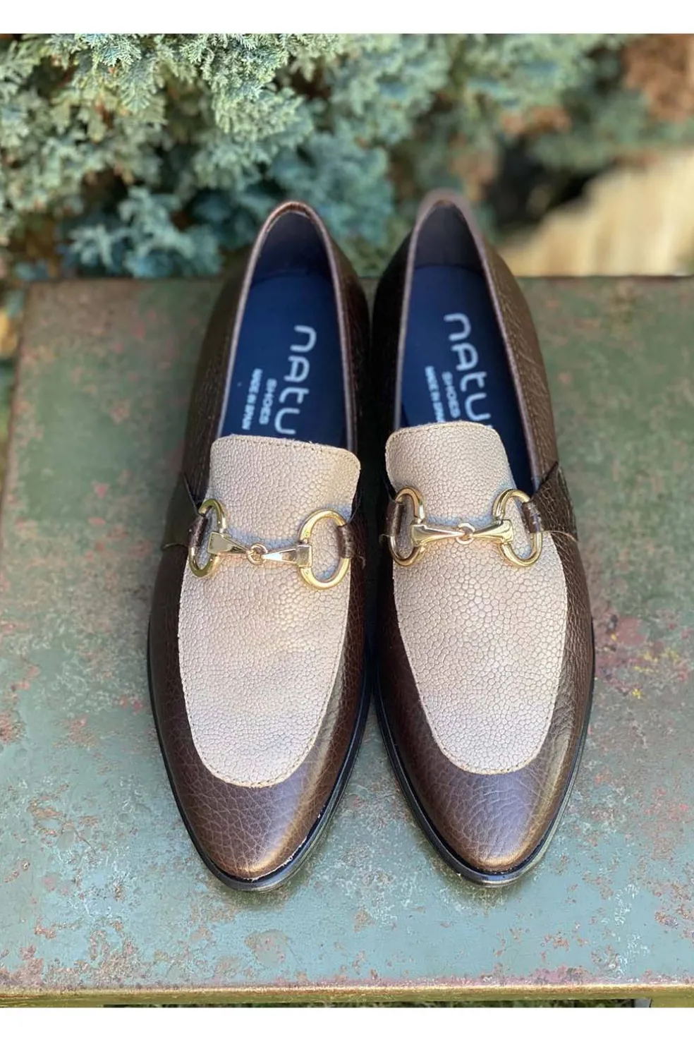 Zapato de piel combinado en marrón y beige.