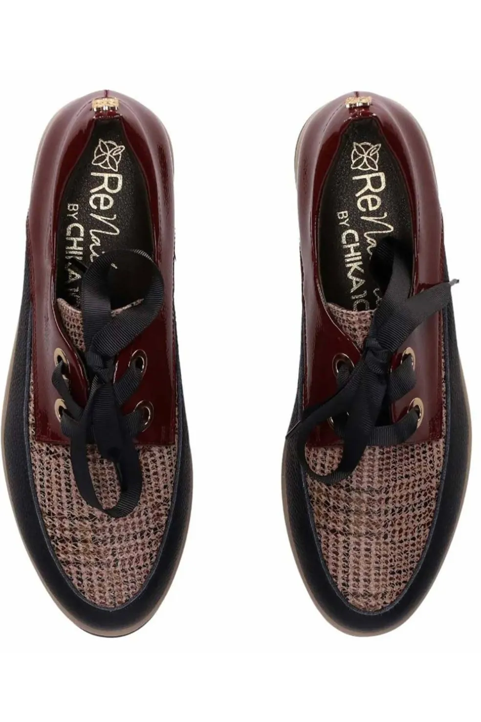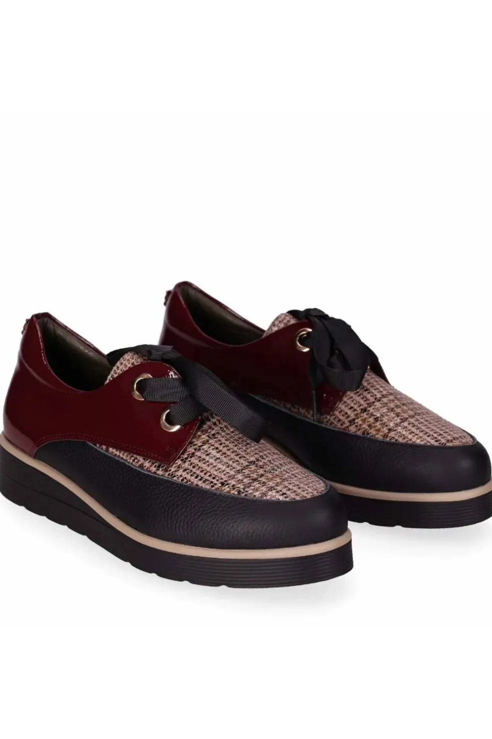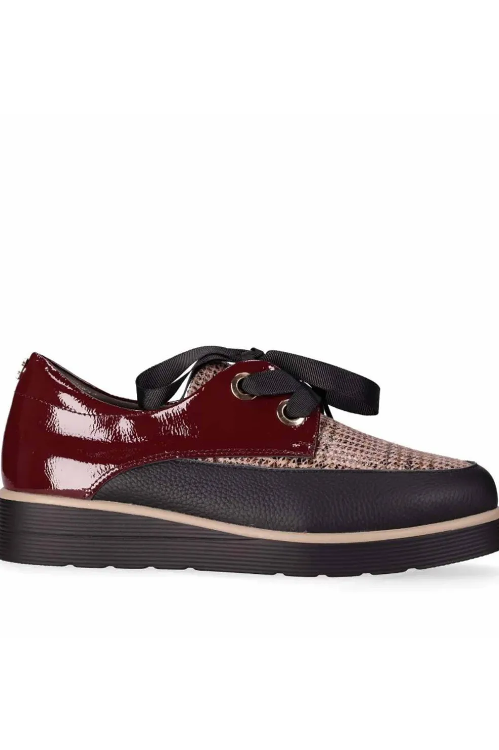 Zapato con suela robusta y combinación de texturas: Este elegante zapato combina varias texturas para un resultado visual impactante. Destacan sus tres grandes ojales con lazada de cinta y su gruesa suela con diseño en capas. ¡El zapato perfecto para añadir un toque moderno y cómodo a tu día a día!